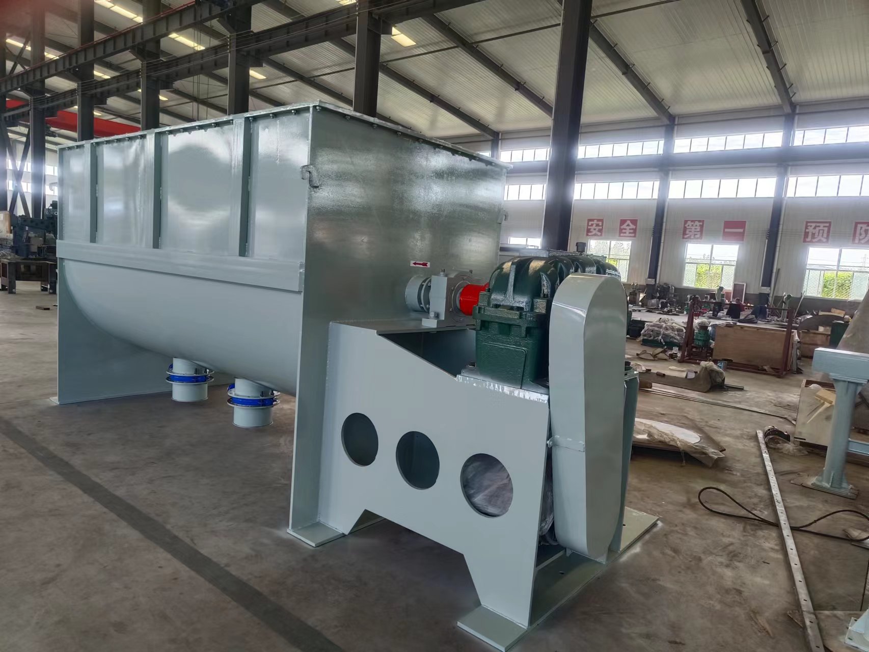 臥式螺帶混合機以高效、快速混合物料,在攪拌軸的螺旋帶運動下,使內外螺旋帶在較大范圍內翻動物料,內螺旋帶將物料向兩側運動,外螺旋帶將物料由兩側向內運動,使物料來回摻混 另一部分物料在螺旋帶推動下,沿軸向徑向運動,從而形成對流循環。